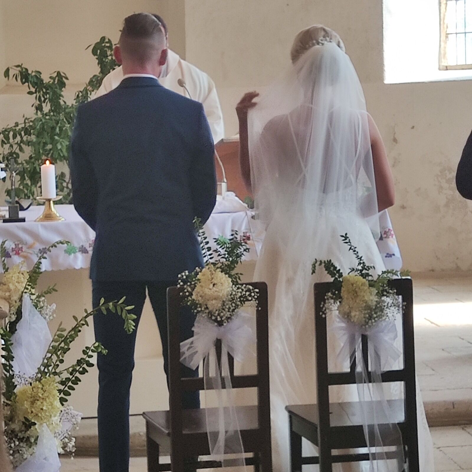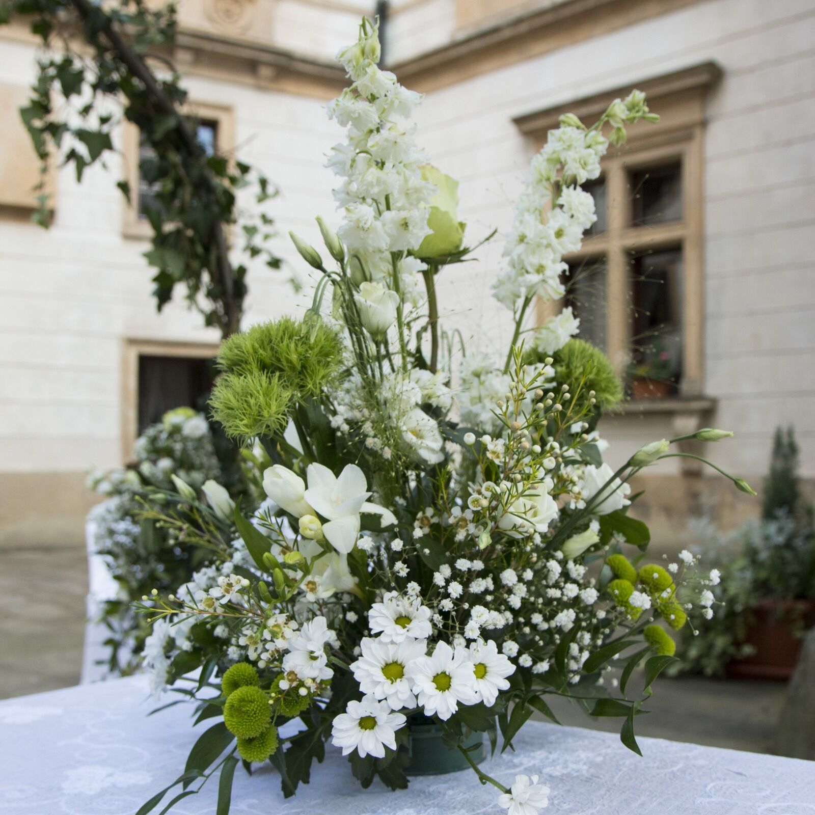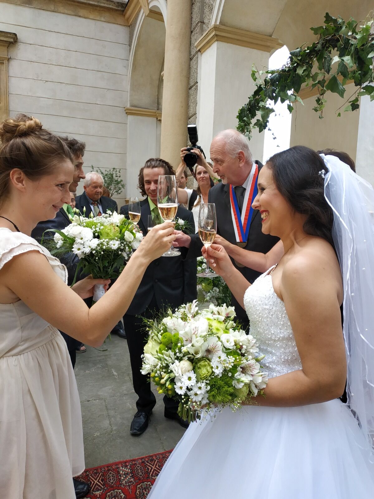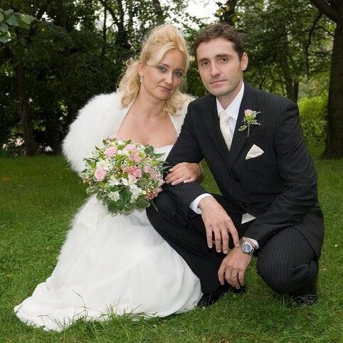 Tato svatba v kostele byla velkolepá. Kombinace jiřin, alstromerií,a růží v kytcích a bílých alstromerií a gypsophily ve výzdobě kostela. Honosně ozdobená auta vezla svatebčany z Prahy na venkov na hostinu.