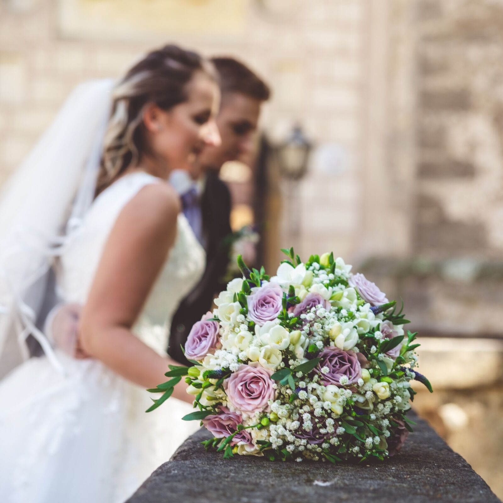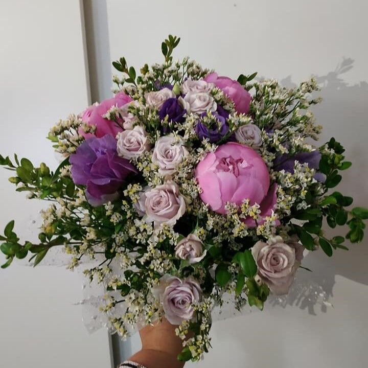 Něžná růžovo - fialová svatba. Růže doplněné frezií, chryzantémou a veronicou, jemnou gypsophilou a zelení.