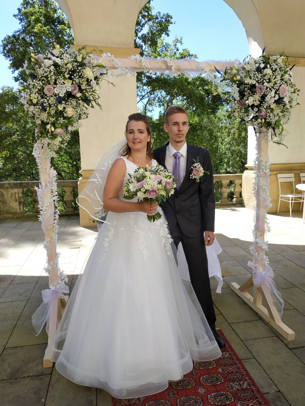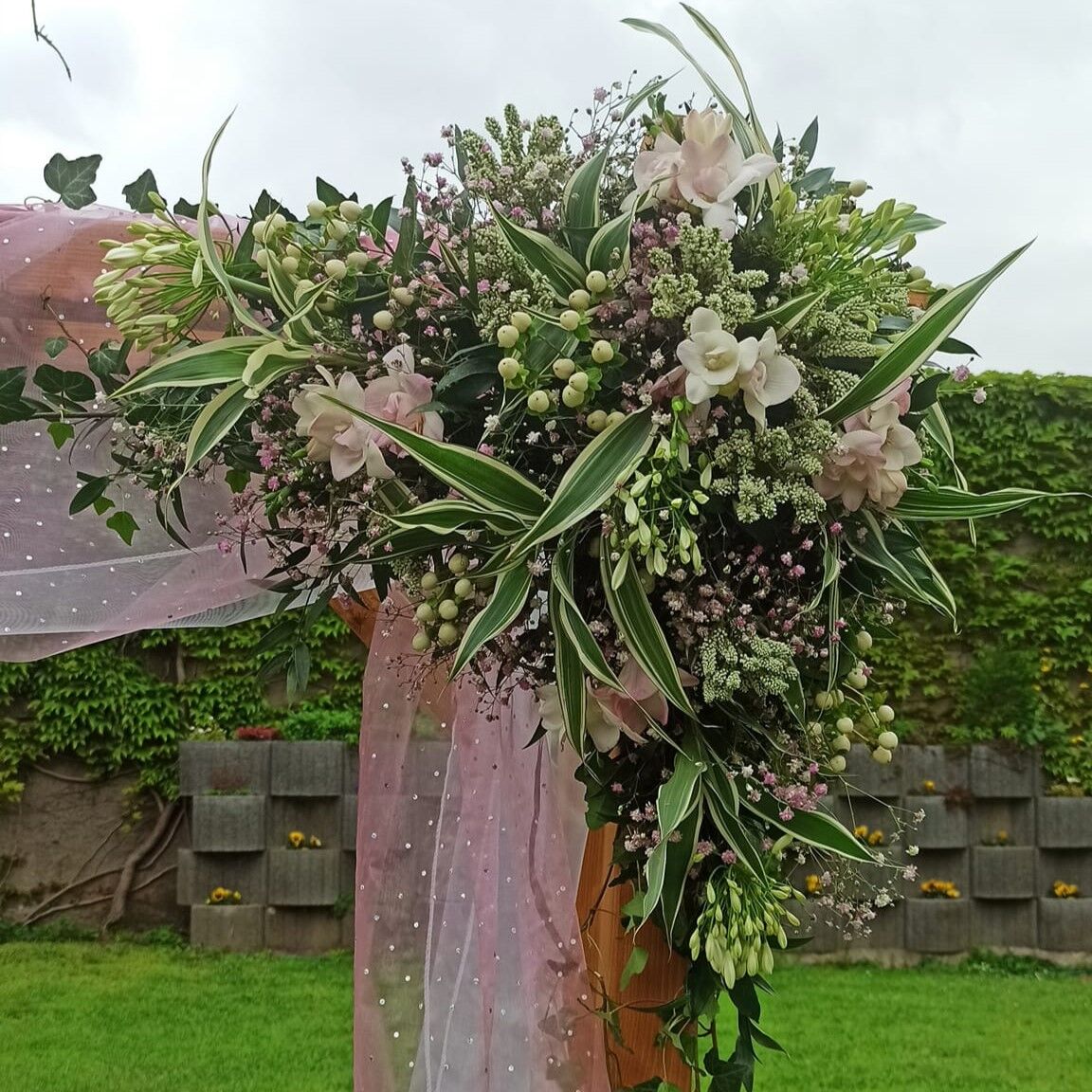Růžové alstromerie, růžová gypsophila, listy draceny, to byl základ pro tuto svatbu s bohatě zdobenou slavobránou. Květiny zdobily i účes nevěsty.