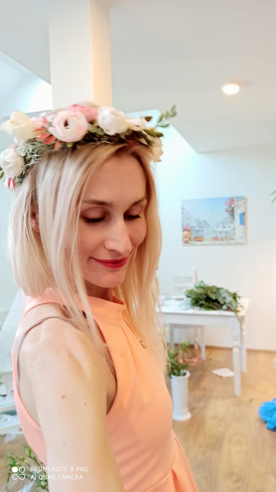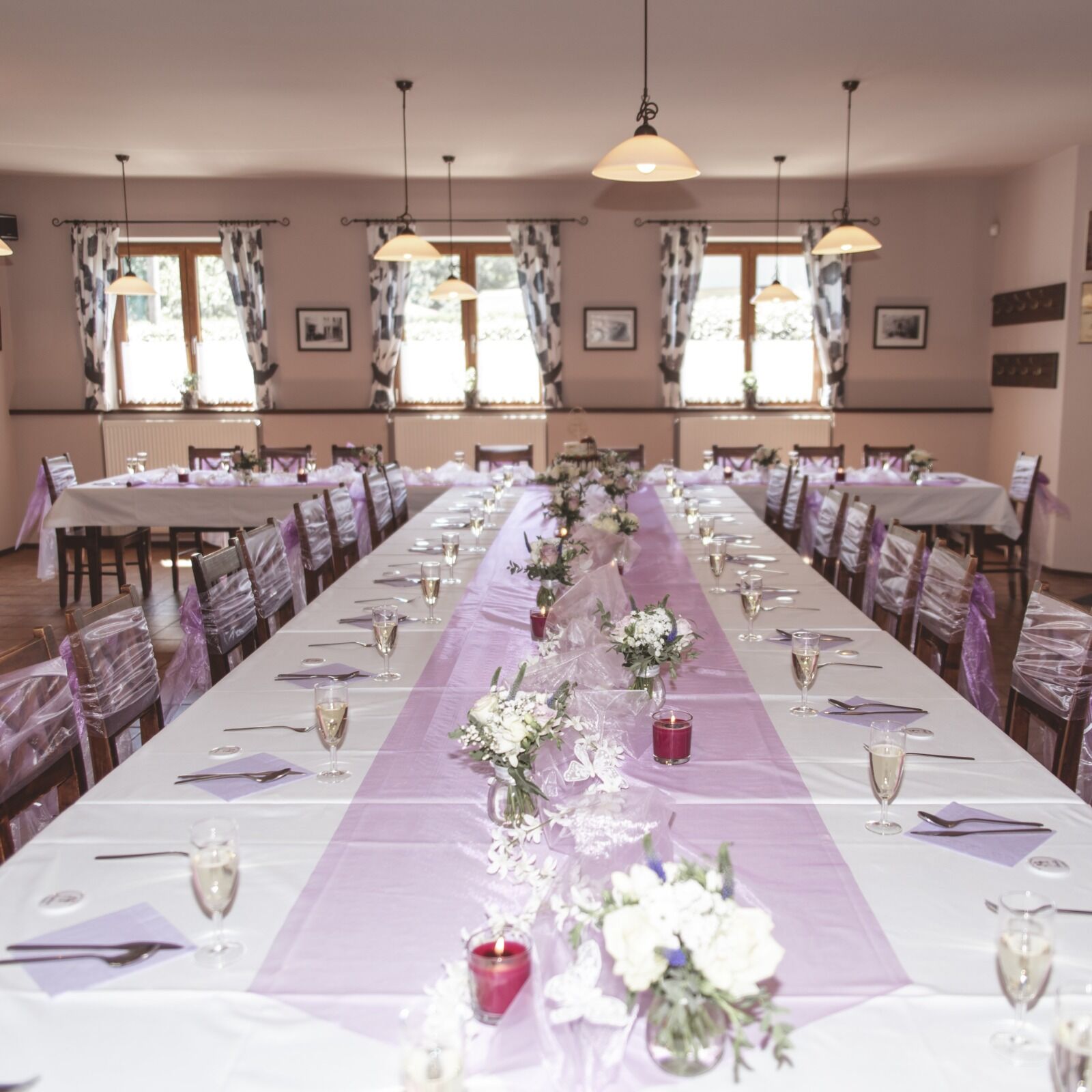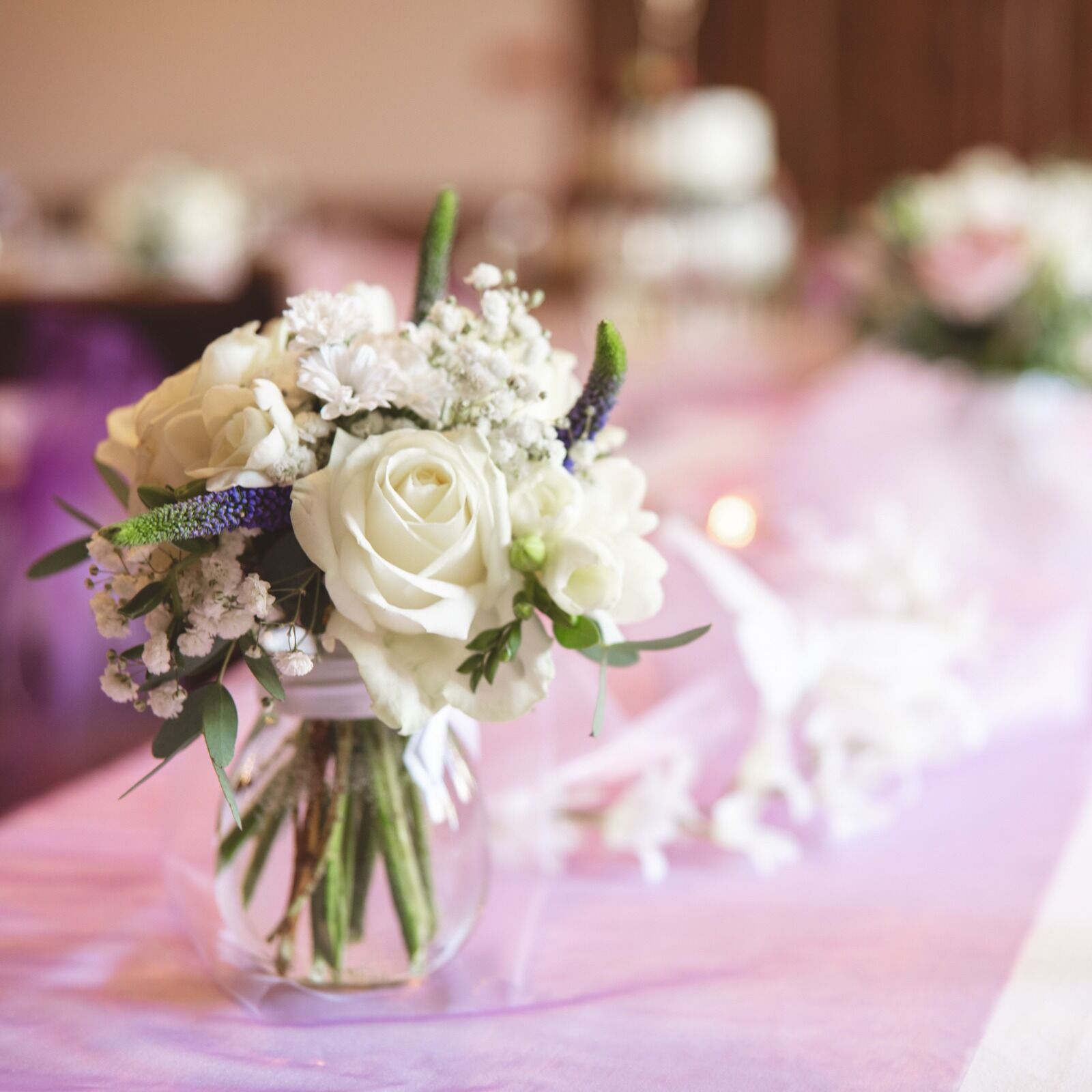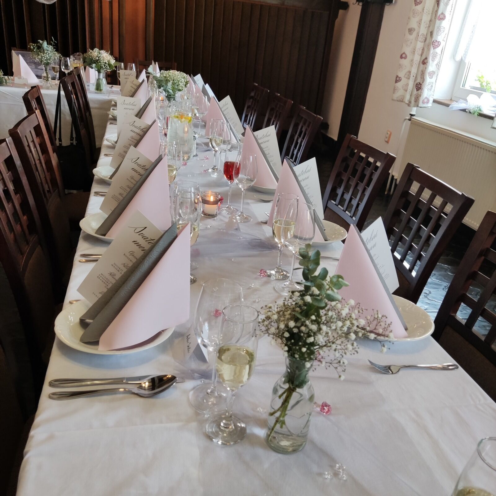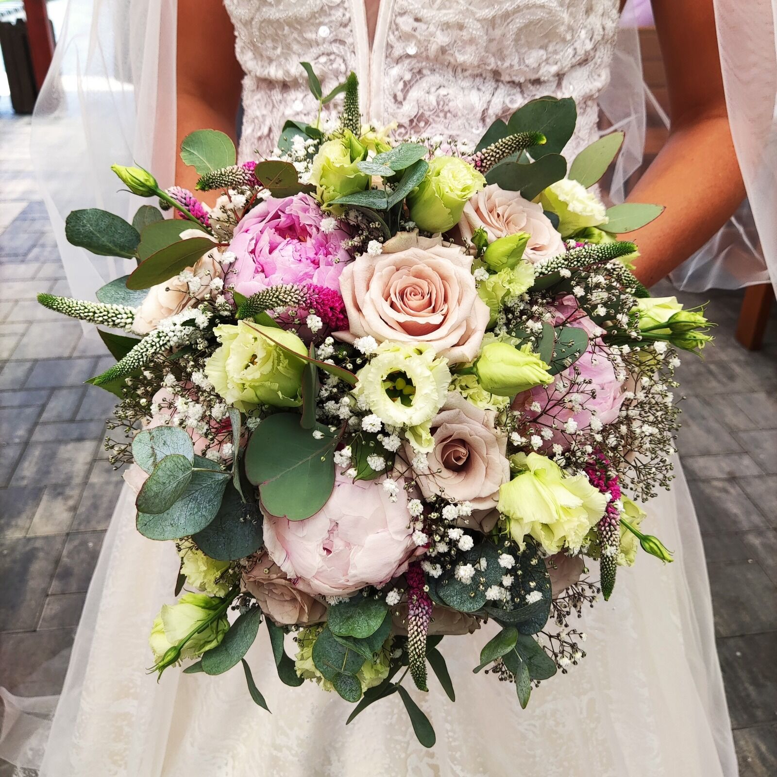 Růžová s pudrovou, elegantní kombinace nádherných pudrových růží s růžovými pivoňkami, doplněné o výraznější veronicu a smetanové plnokvěté alstromerie s gypsophilou. . Stejně bohará byla i výzdoba obřazního i svátečního svatebního stolu.