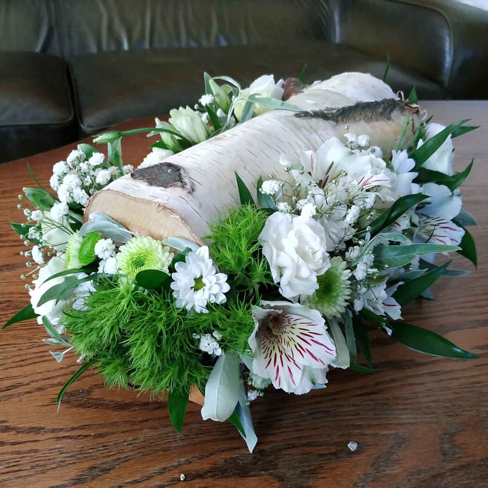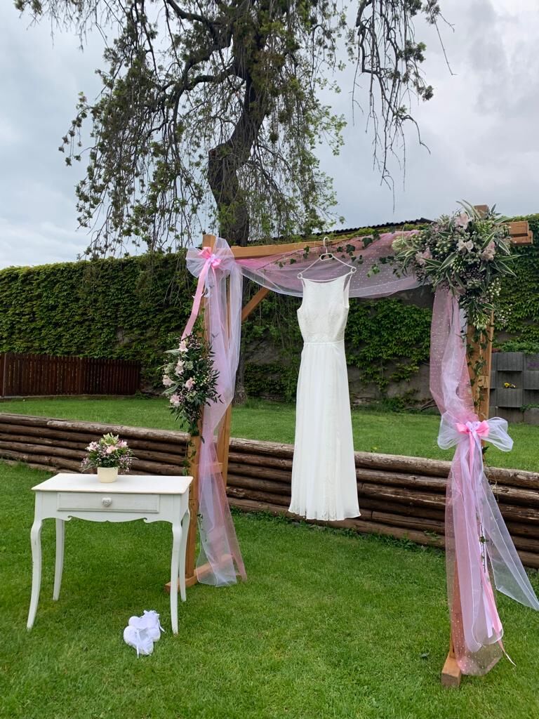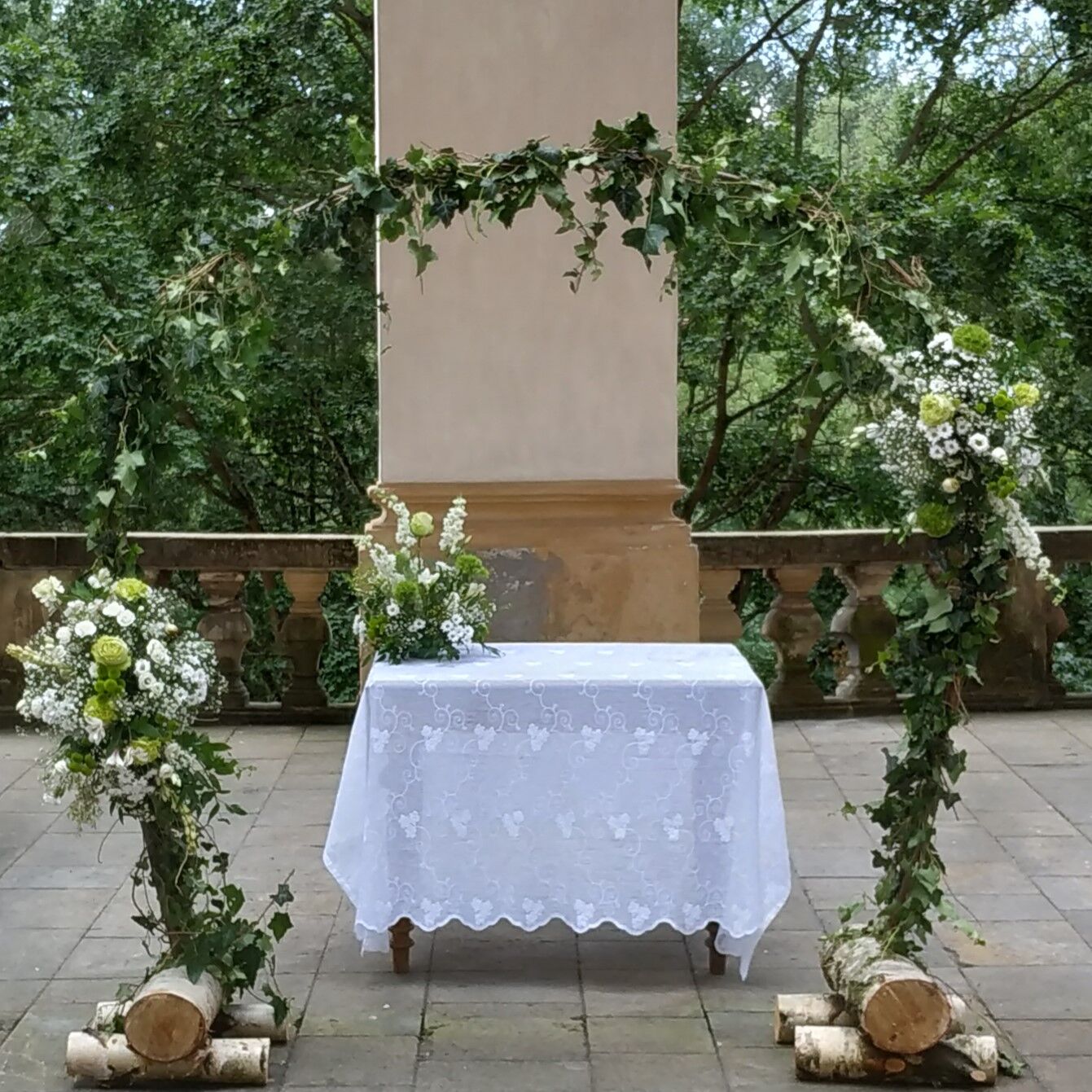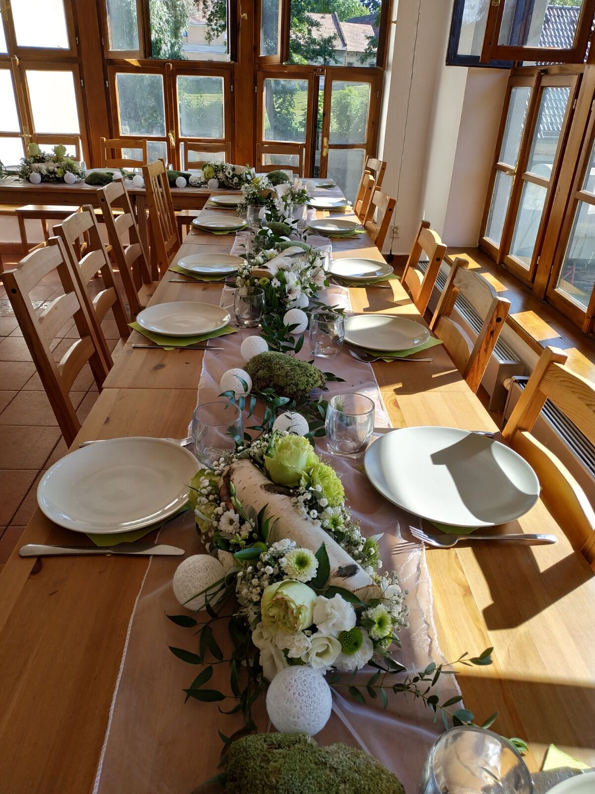 Bílo zelená svatba , kde nevěsta miluje břízu. Slavobrána, dekorace na stoly i dost - to vše byla bříza v záplavě zelených růží, zelených chryzantém i karafiátů, bílých santinek, gypshophily , bílých drobných karafiátů, delphinia, frezií, alstromerií a panika. Celá svatba nádherně voněla.