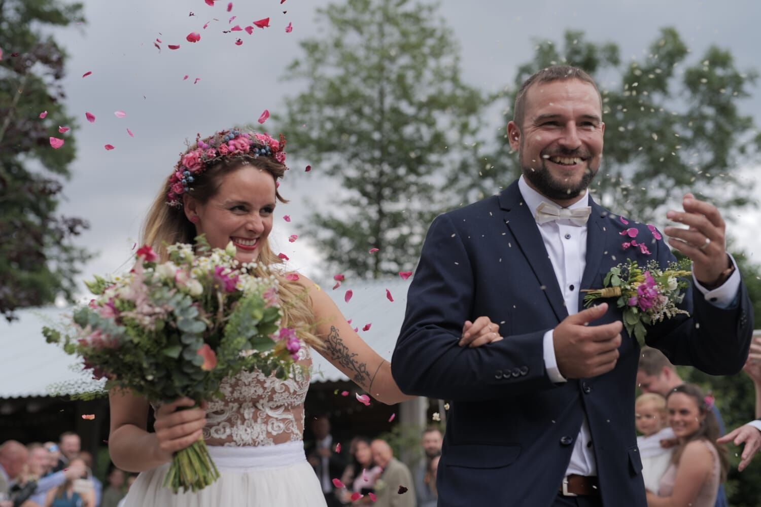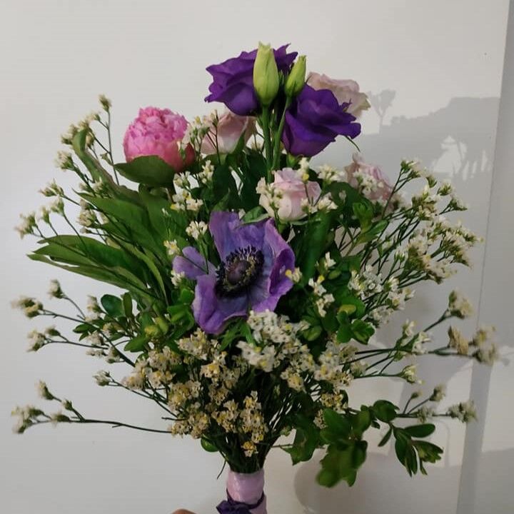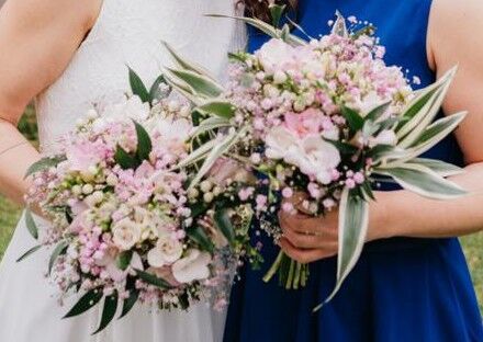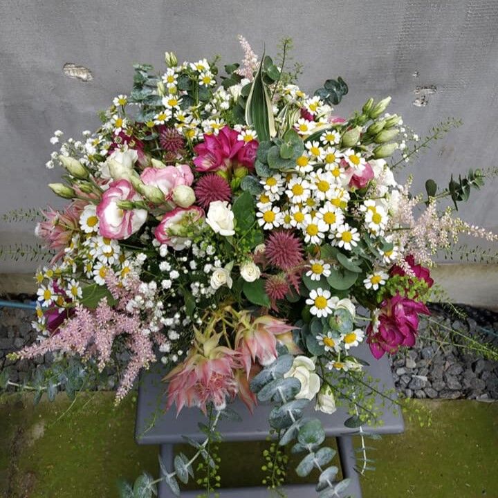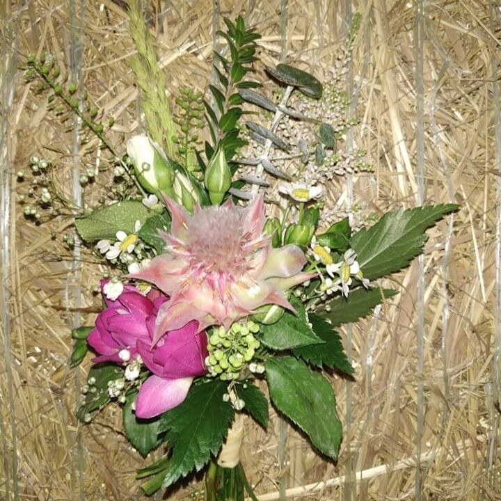 Luční kvítí, kytice plná heřmánku, ale i bodláků, kokošky a trav. Veselá, barevná, a skvěle vysthující nevěstu a celou společnost na svatbě v prostředí starého statku. Družičky a maminky měly místo kytic květinové náramky, nevěsta bohatý věneček z květin.