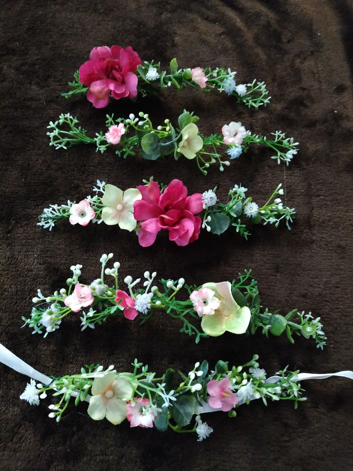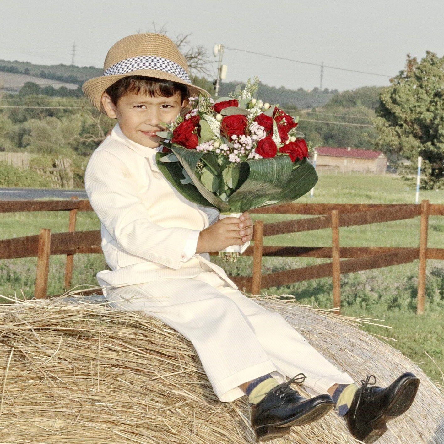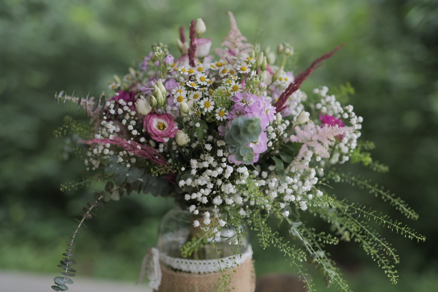 Luční kvítí, kytice plná heřmánku, ale i bodláků, kokošky a trav. Veselá, barevná, a skvěle vysthující nevěstu a celou společnost na svatbě v prostředí starého statku. Družičky a maminky měly místo kytic květinové náramky, nevěsta bohatý věneček z květin.