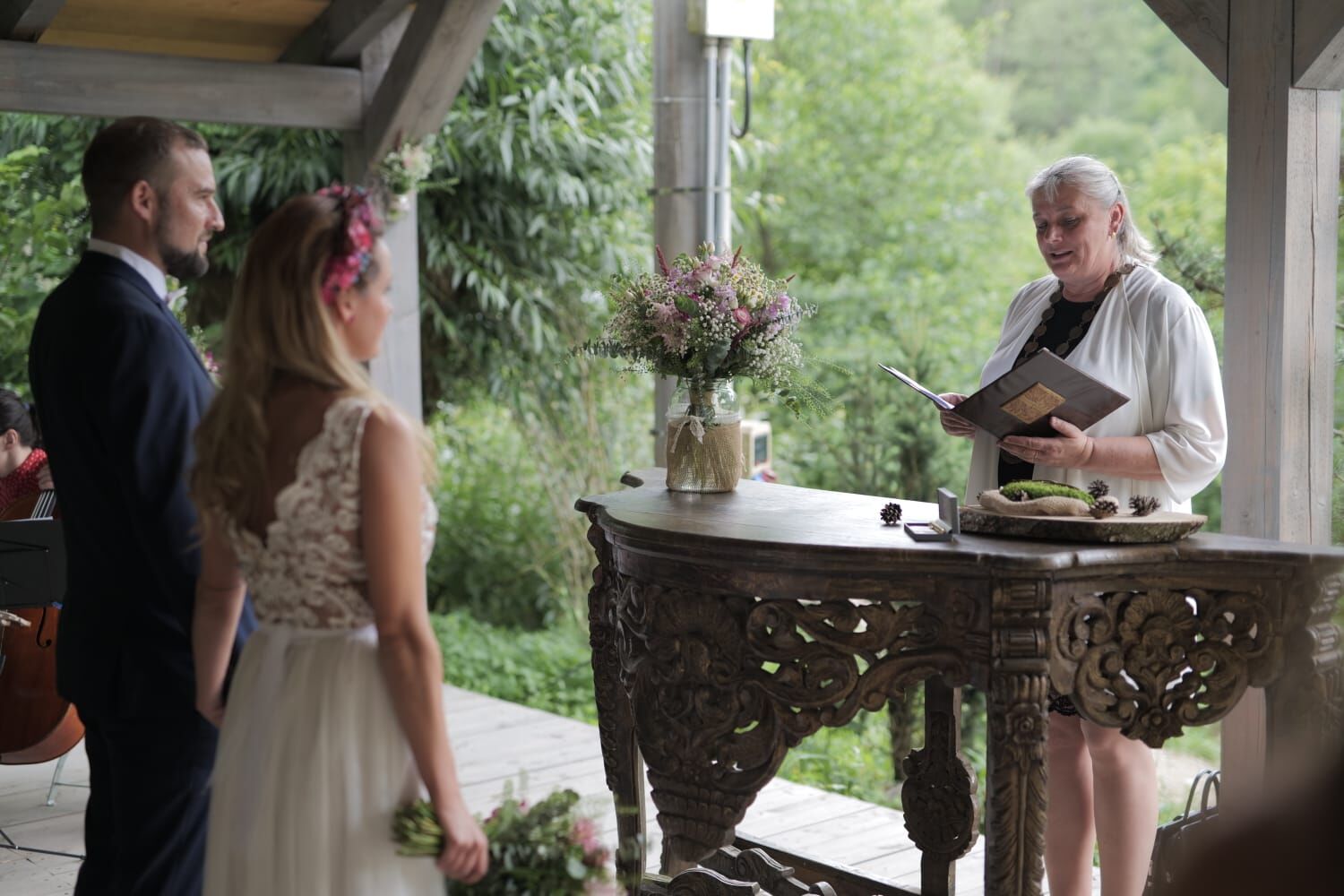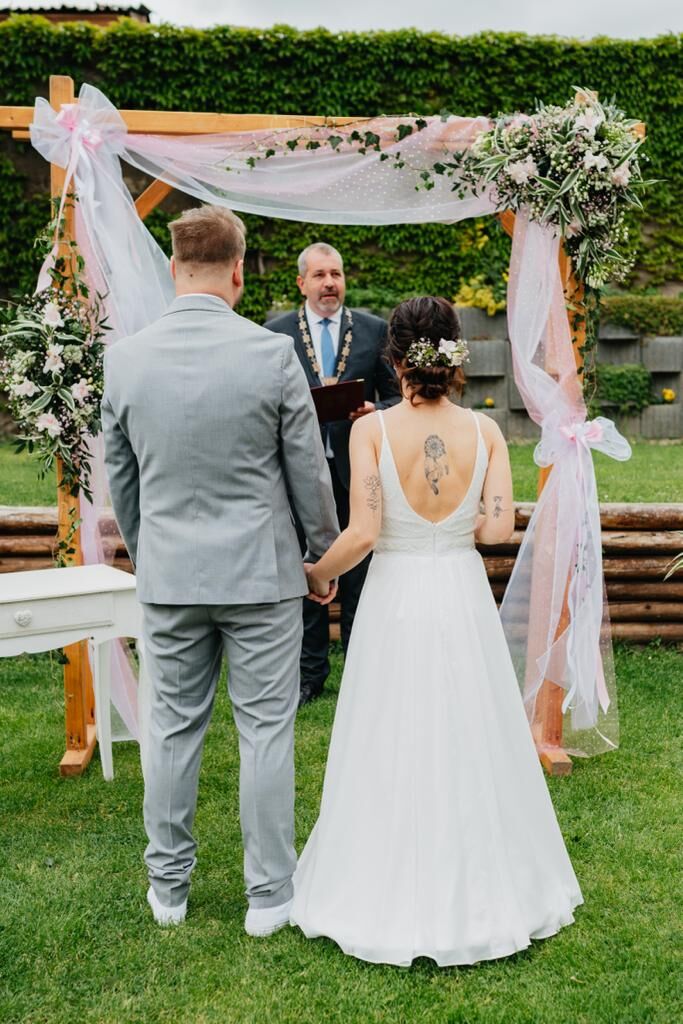 Malá fialovo růžová svatba, jen nevěsta, ženich a svědci.