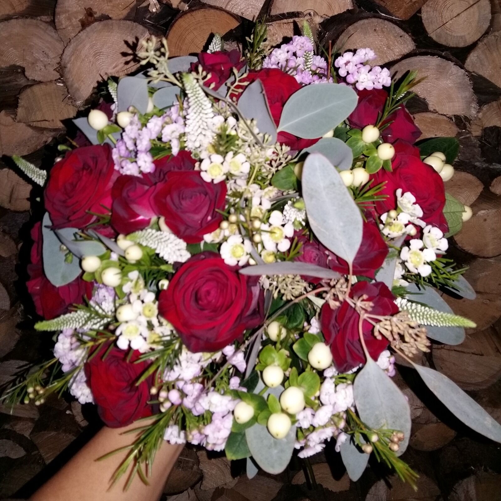 Rudé růže, výrazná květinová varianta pro výraznou osobnost, zjemněné waxflorem v růžové a voňavým eukalyptem